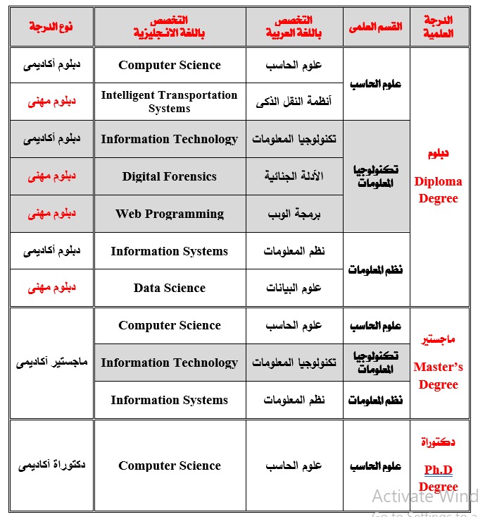 - قسم تكنولوجيا المعلومات: يشتمل على برنامج (تكنولوجيا المعلومات).